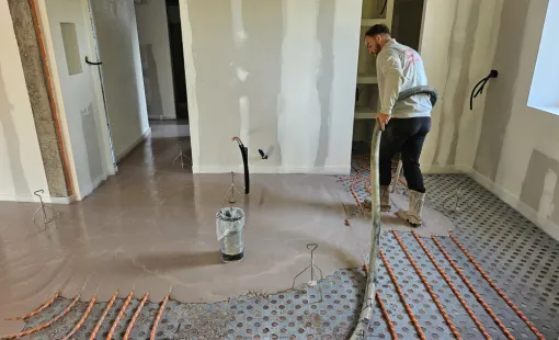 Mise en oeuvre d'une chape liquide de type anhydrite thermiomax sur la commune de Lanas à côté d'Aubenas sur une rénovation ou les altimétries étaient très faibles.