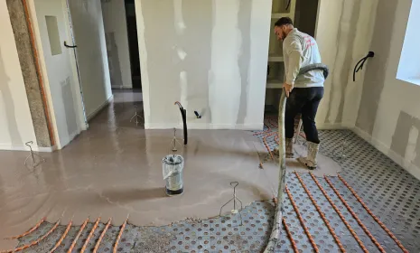 Une chape liquide anhydrite présente une conductivité thermique supérieure et une meilleure fluidité que la chape ciment fluide, ce qui favorise un enrobage parfait des tuyaux de chauffage au sol. Dans ce cas, la répartition homogène de la chaleur et la planéité optimale de la chape anhydrite permettent d’optimiser le rendement énergétique du système de chauffage tout en réduisant les risques de fissuration.